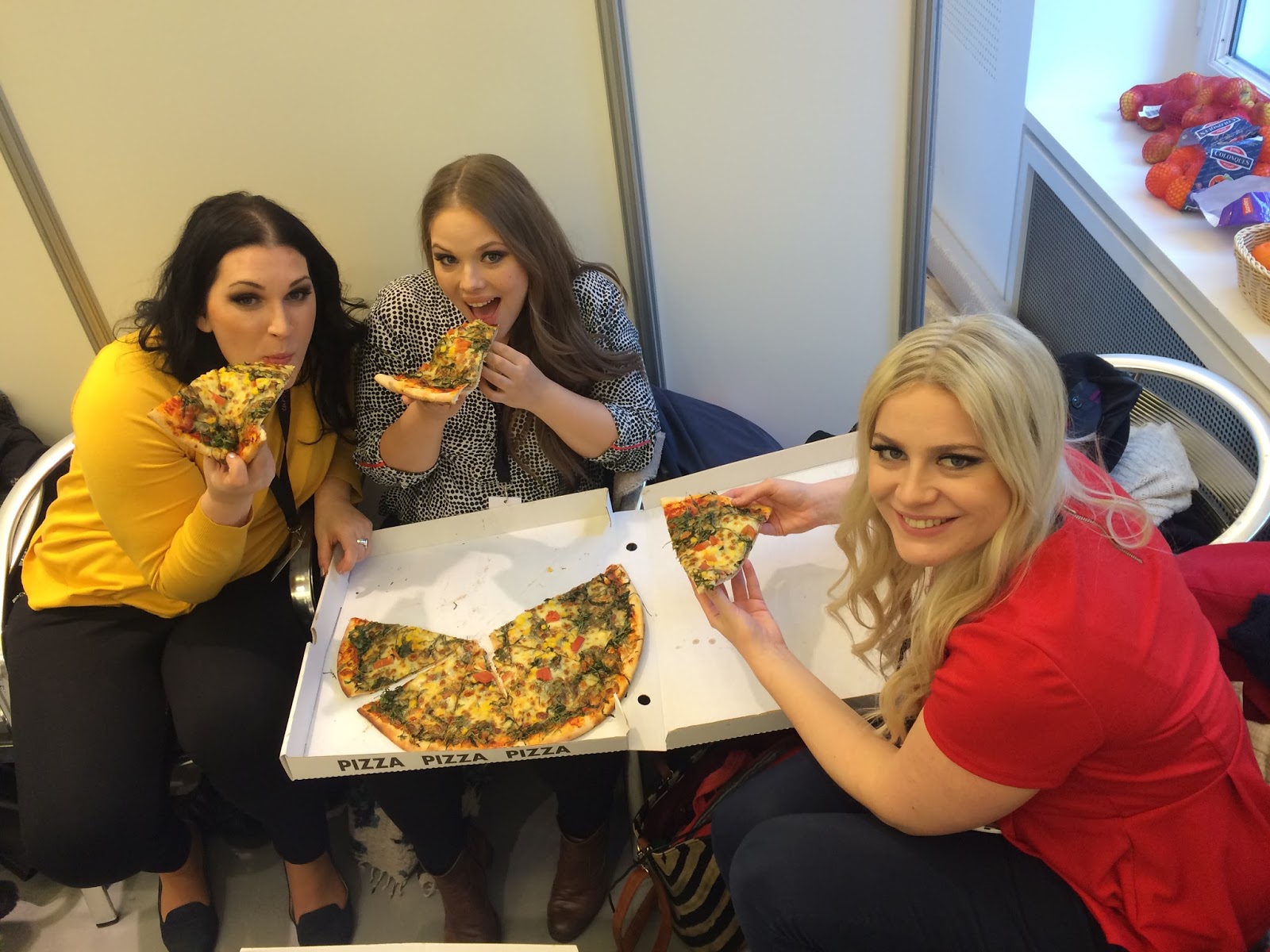 Prehliadky boli v utorok a stredu ráno o 11 a poobede o 15, pričom zakončenie bolo vo štvrtok jednou prehliadkou o 12. Pre nás to znamenalo vstávanie o 5 aby sme o 6 boli prichystané v šatni na makeup a vlasy, kde sa o nás starali tri vizážistky. Ako vidíte, aj organizátori na nás mysleli a nedostali sme žiadnu rukolu, ale poriadnu pizzu 🙂